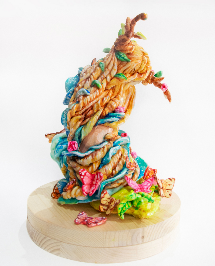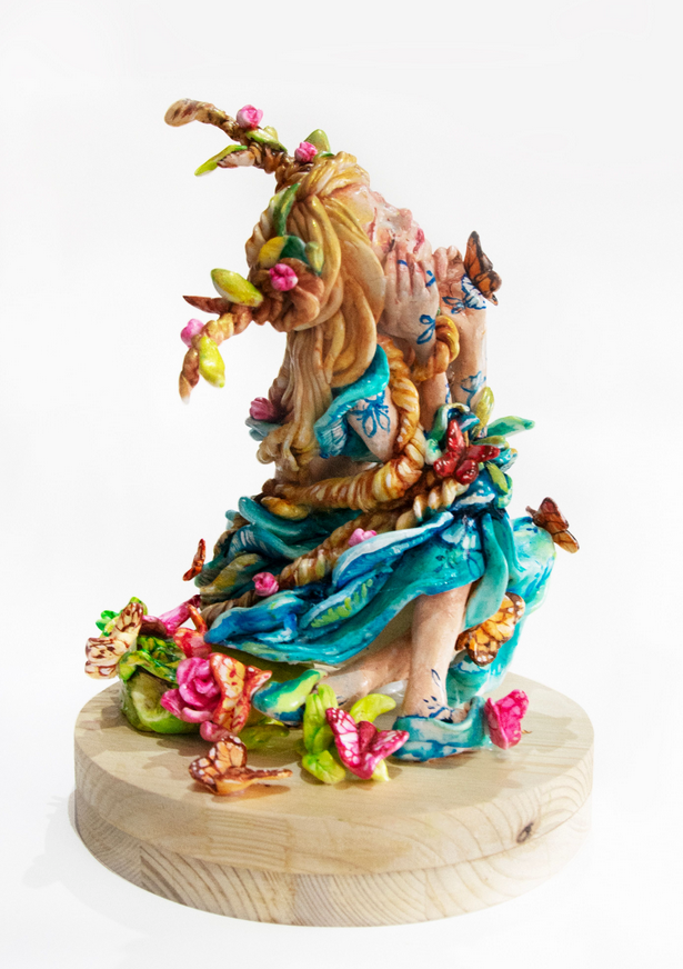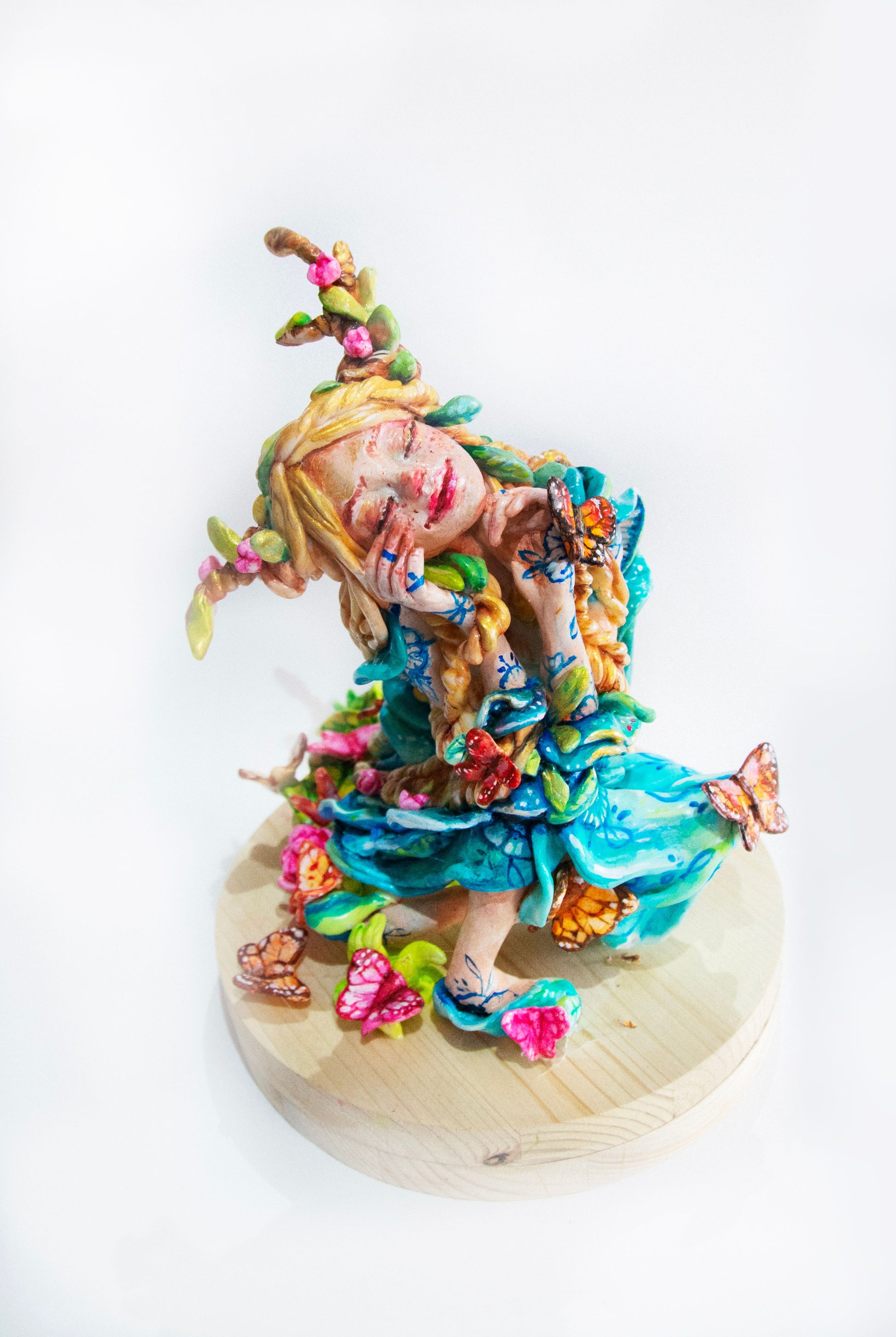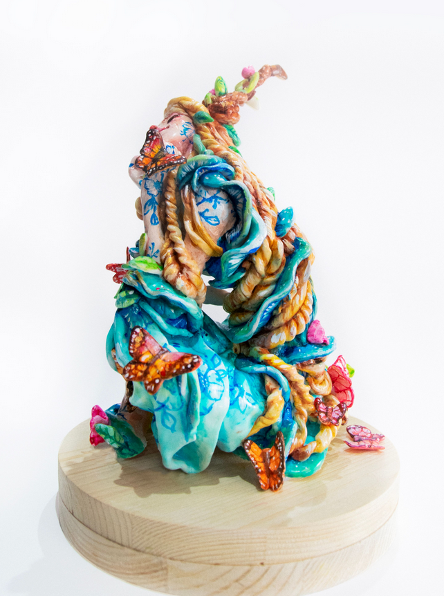 Esta escultura representa a un hada en una postura serena y soñadora, con los ojos cerrados y una expresión de paz. Está ricamente decorada con mariposas de colores vibrantes que reposan sobre su cuerpo y vestido, aportando dinamismo y un aire mágico a la pieza. Su cabello trenzado se entrelaza con elementos naturales como hojas y flores, destacando su conexión con la naturaleza. El vestido azul turquesa, lleno de detalles y texturas, evoca el fluir del agua o del viento, acentuando su carácter etéreo. Colocada sobre una base de madera clara, esta figura combina fantasía y artesanía en una pieza delicada y cautivadora.