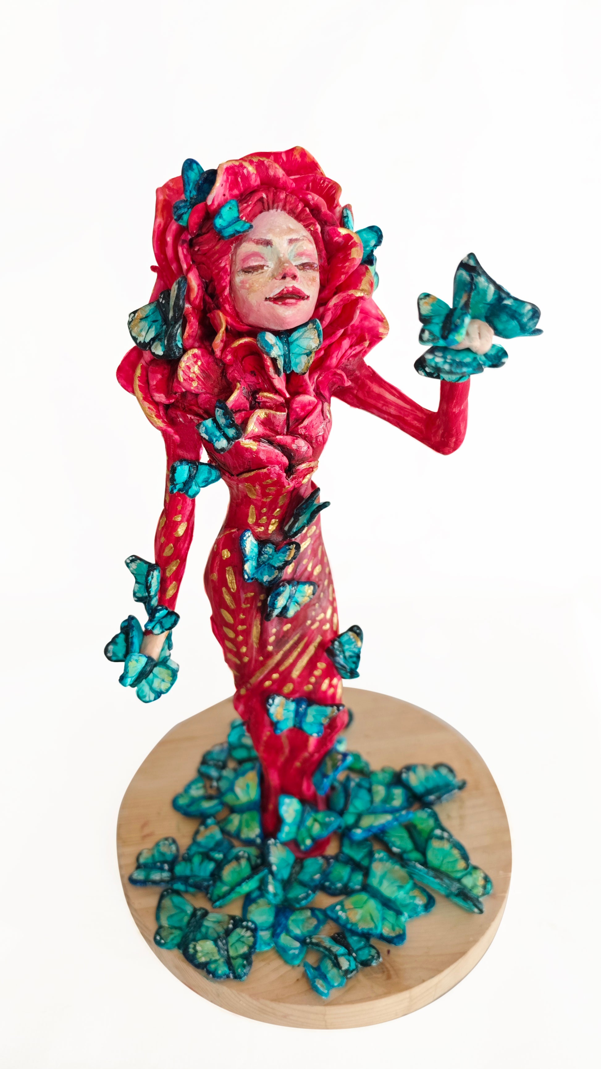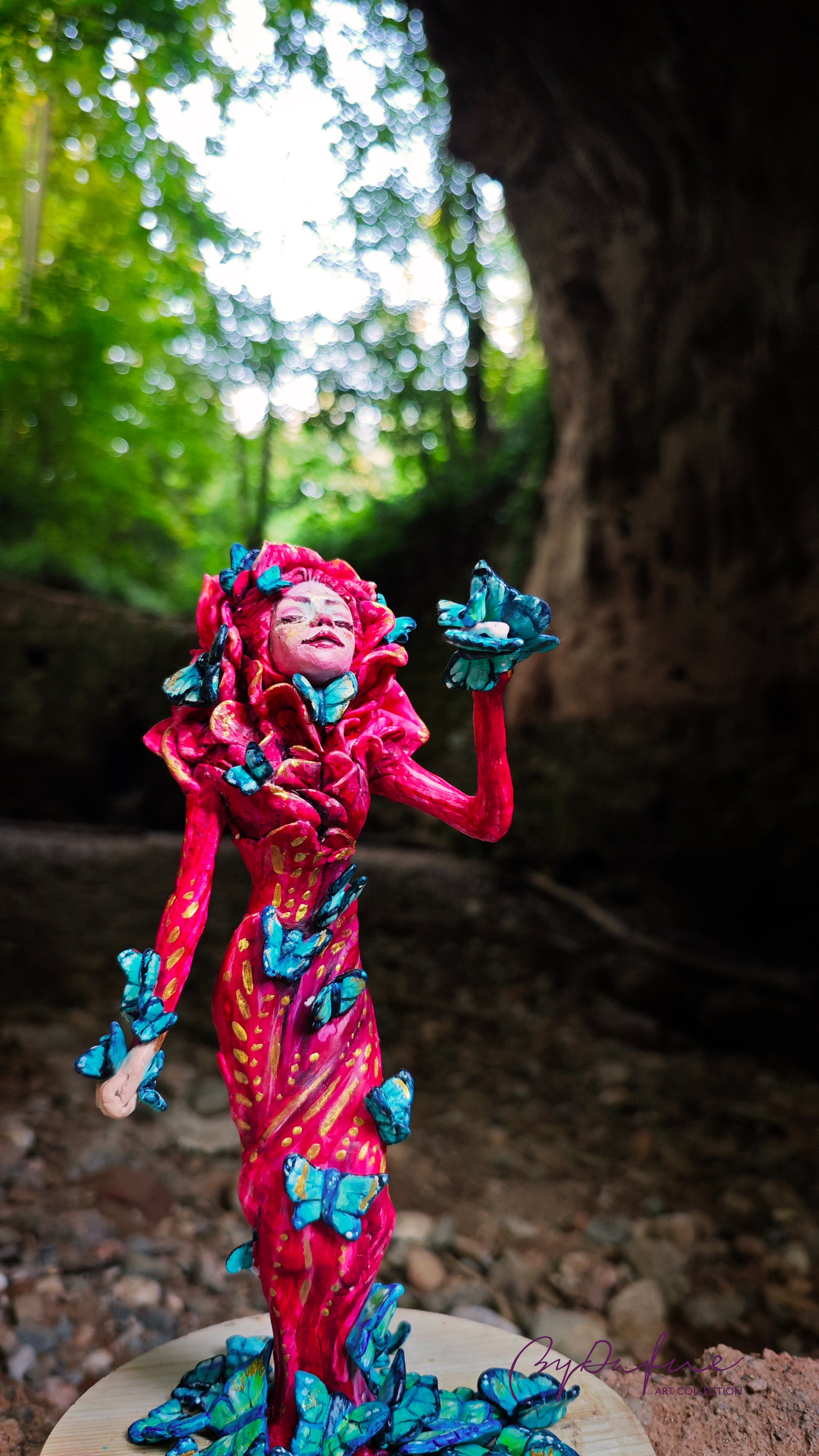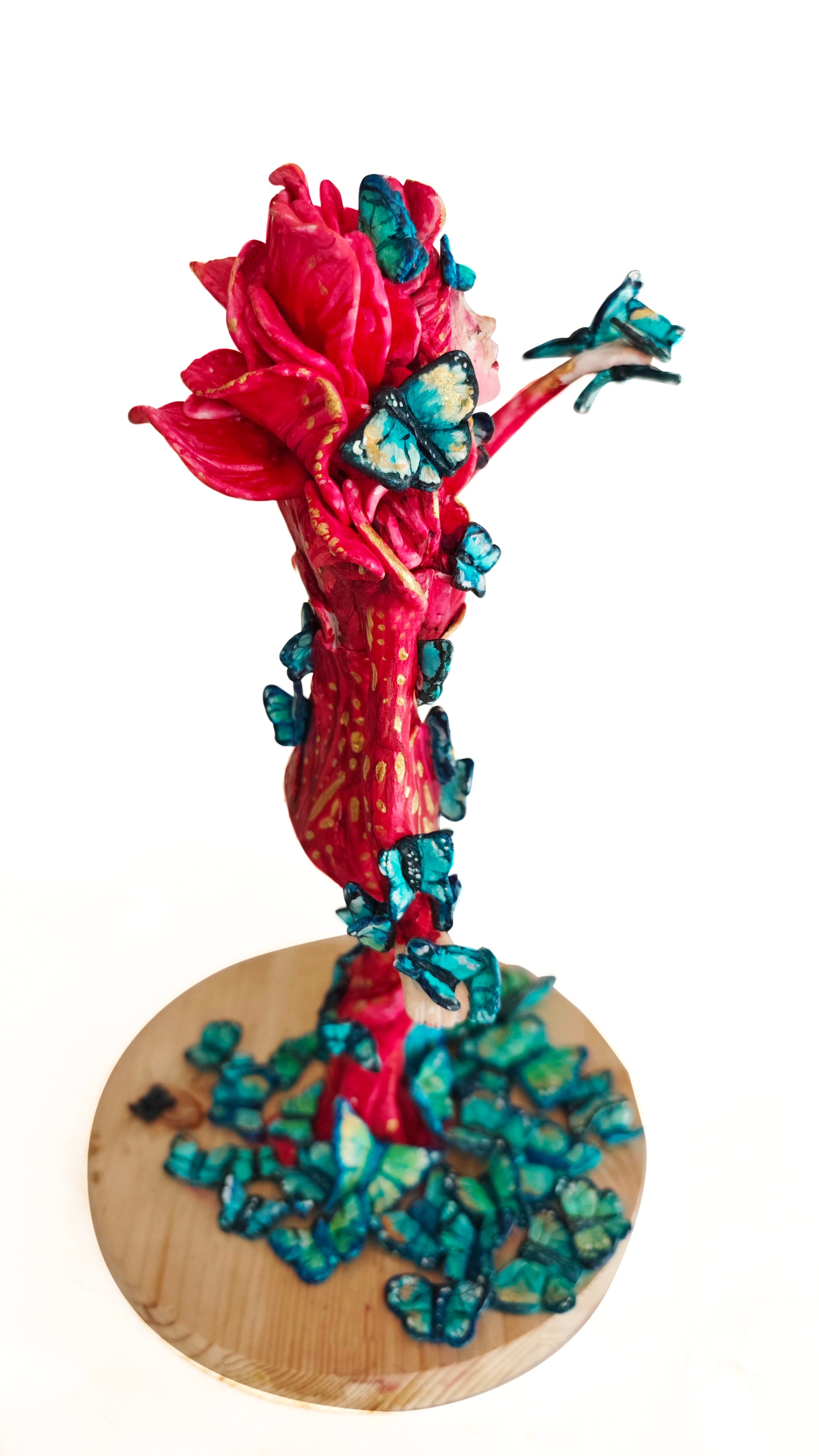 Esculpida en arcilla polimérica "Flora" emerge como una manifestación del bosque una guardiana que encarna la íntima fusión de lo humano y lo natural. La artista moldea una figura serena cuyo cabello se transforma en una flor carmesí y cuyo cuerpo se funde con las texturas de la corteza y las raíces.Vibrantes mariposas turquesa con acentos dorados parecen desprenderse de su ser creando un flujo de vida y movimiento que la enraíza y la eleva. "Flora" no es simplemente una escultura sino un portal a un mundo de fantasía y tranquilidad.