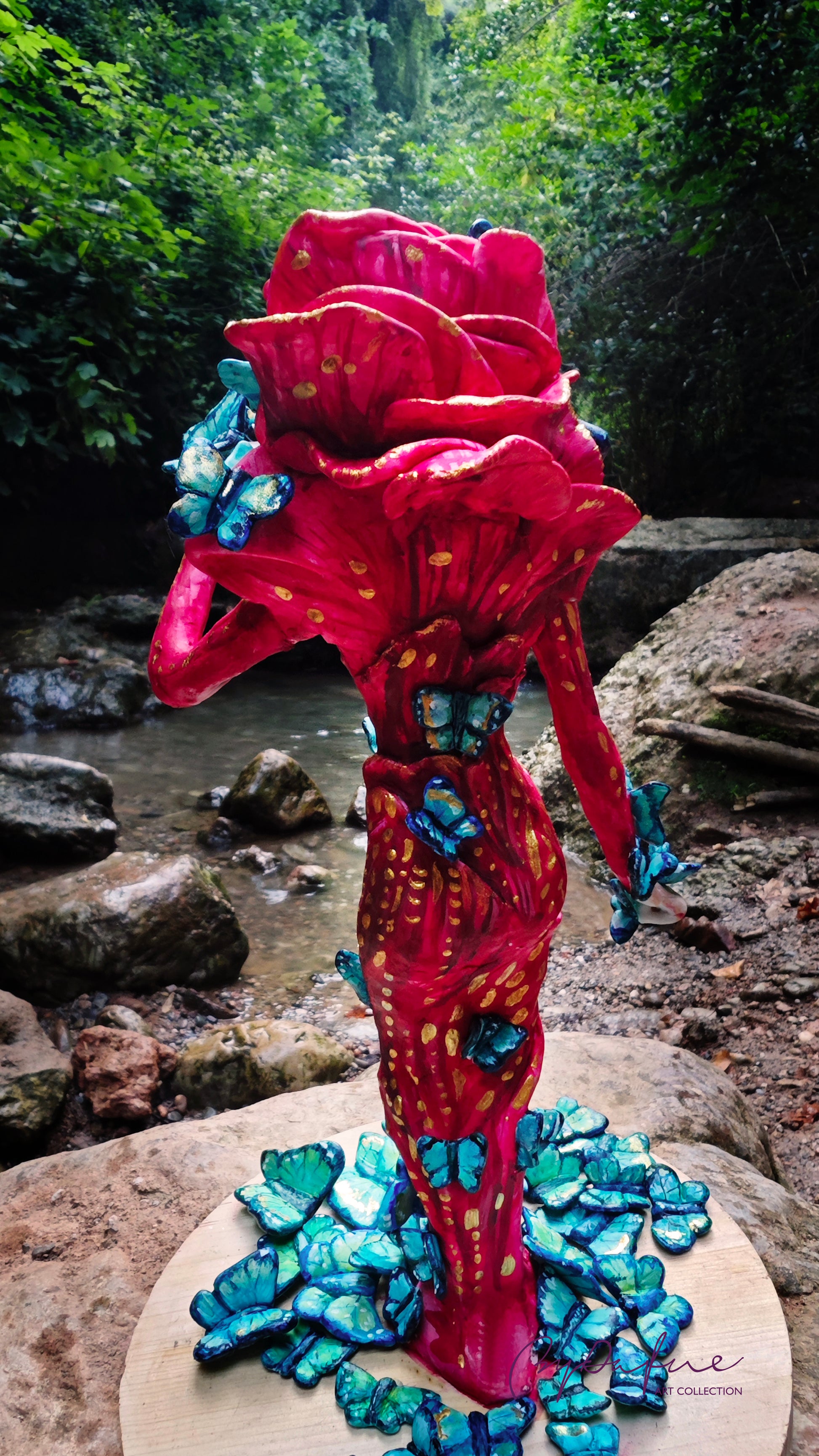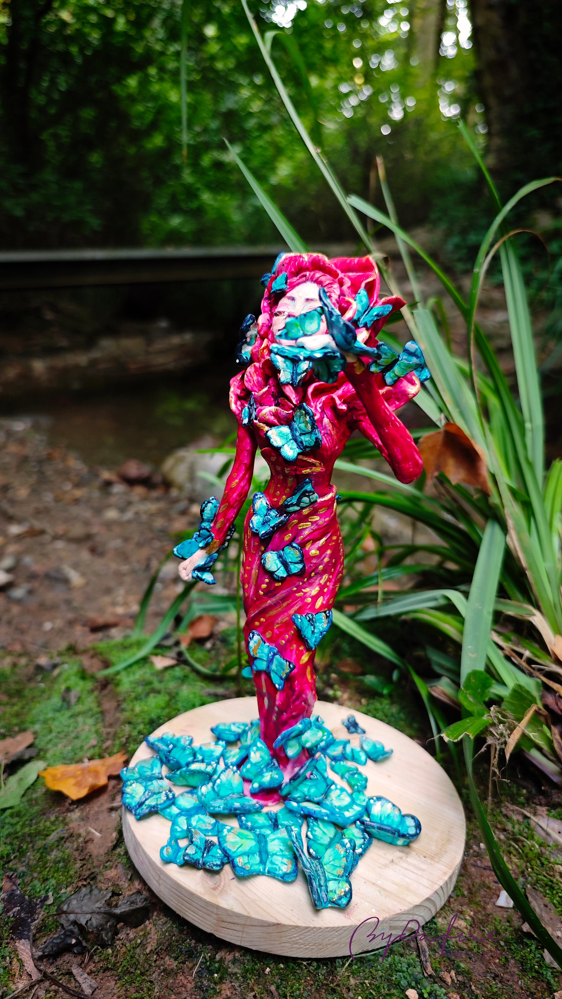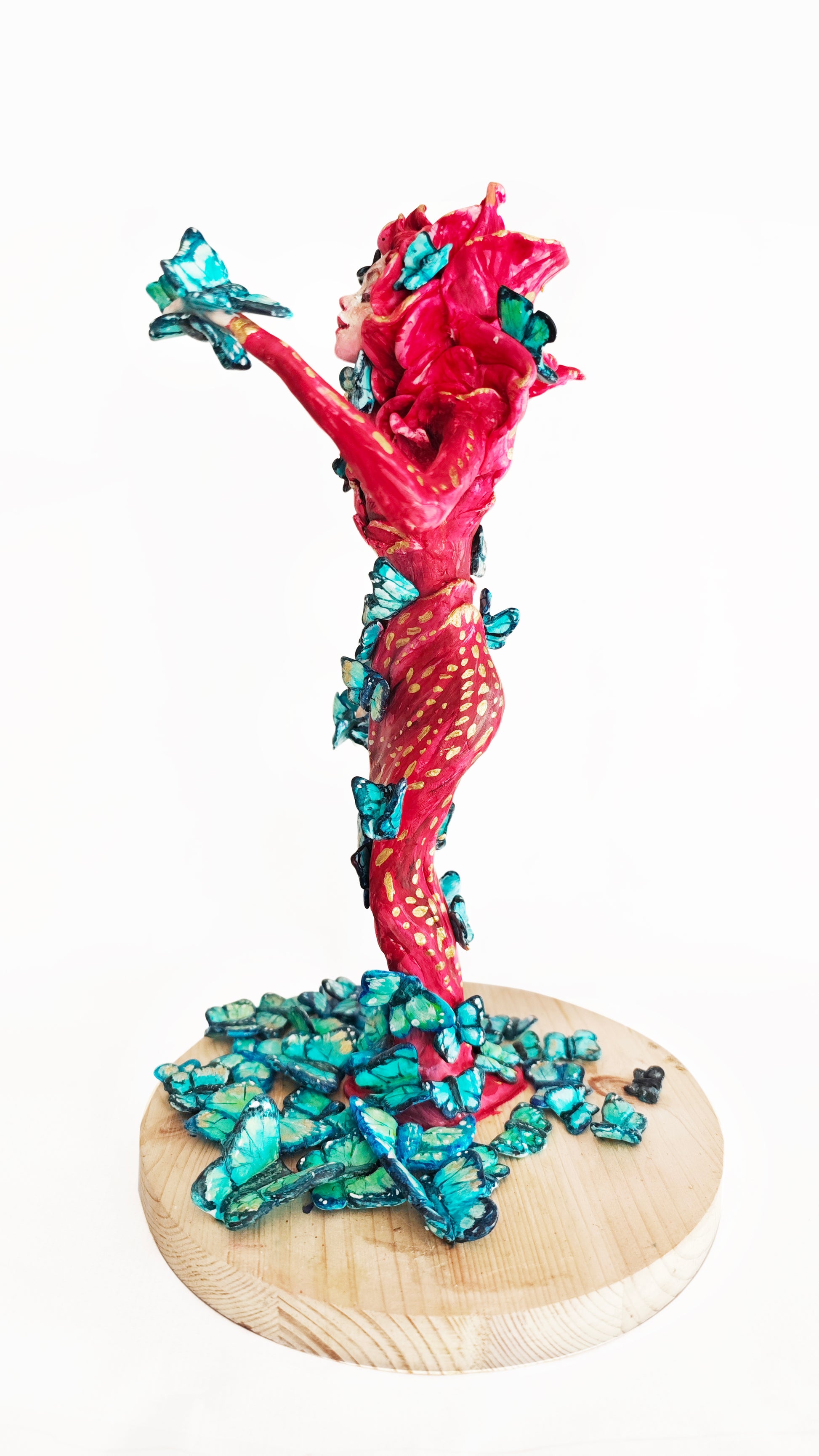Esculpida en arcilla polimérica "Flora" emerge como una manifestación del bosque una guardiana que encarna la íntima fusión de lo humano y lo natural. La artista moldea una figura serena cuyo cabello se transforma en una flor carmesí y cuyo cuerpo se funde con las texturas de la corteza y las raíces.Vibrantes mariposas turquesa con acentos dorados parecen desprenderse de su ser creando un flujo de vida y movimiento que la enraíza y la eleva. "Flora" no es simplemente una escultura sino un portal a un mundo de fantasía y tranquilidad.