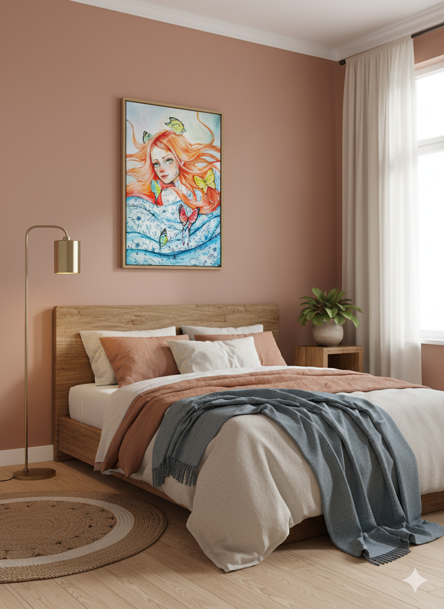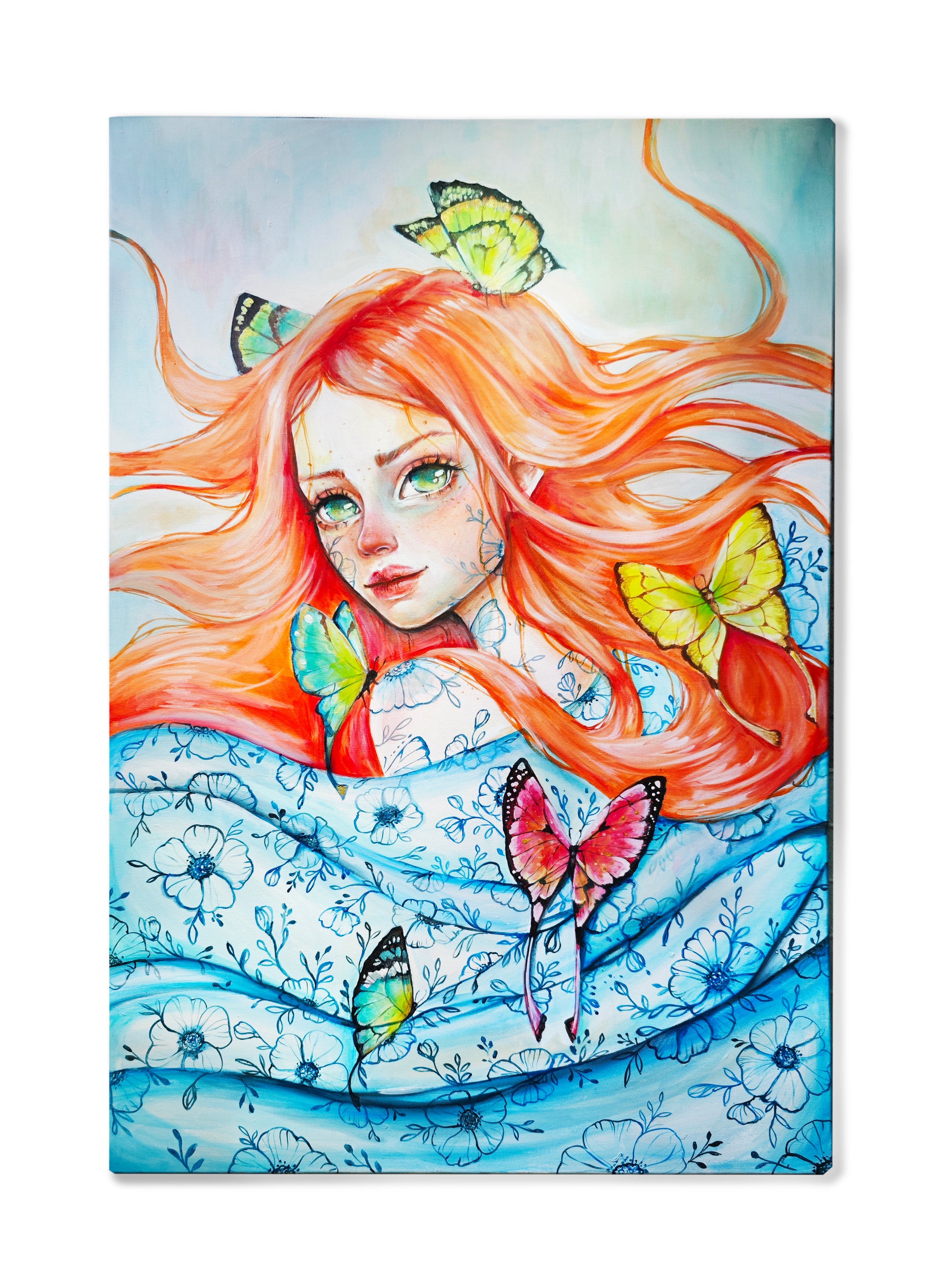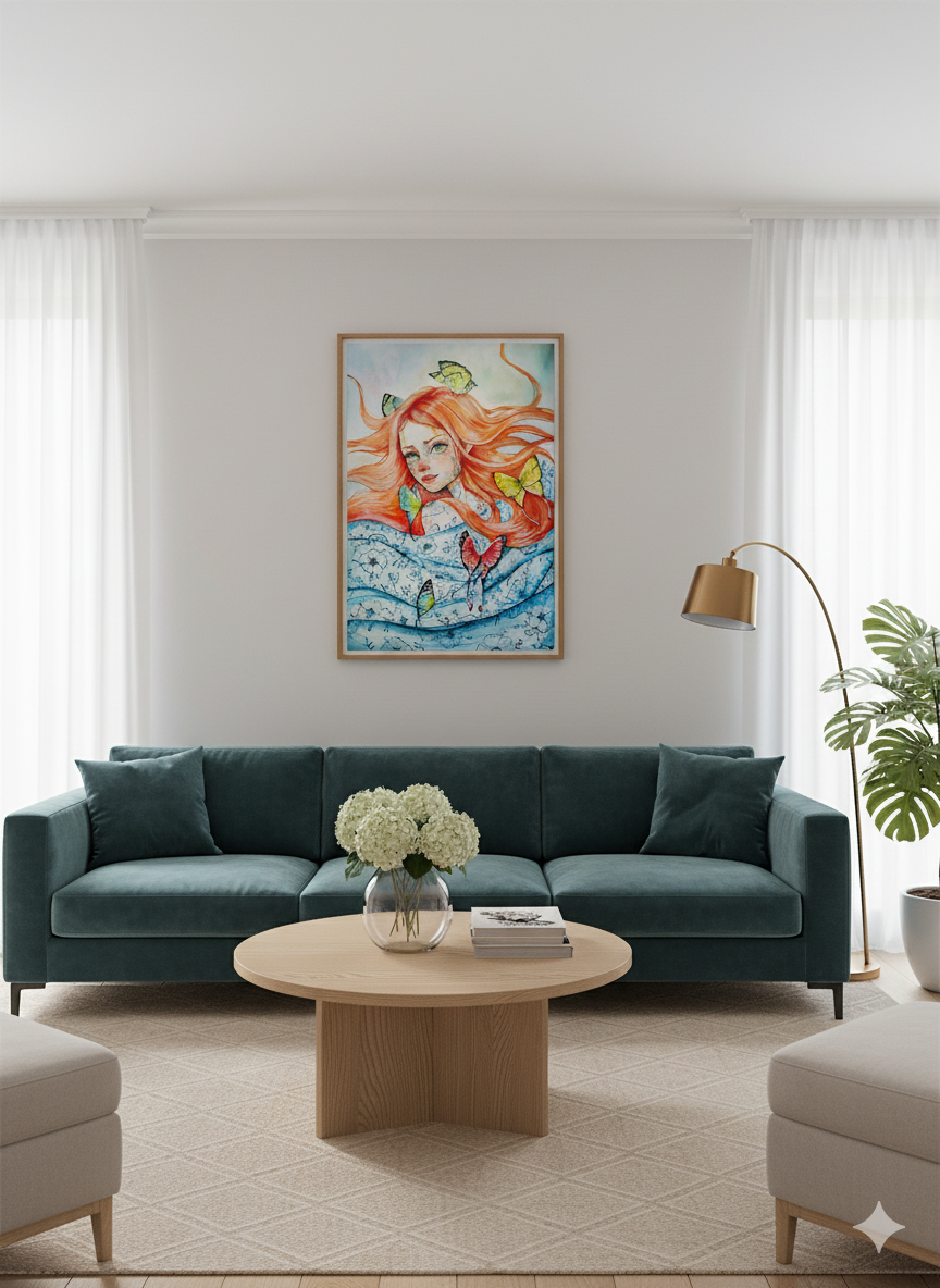 En un rincón secreto del mundo, entre las nubes de flores y los susurros del viento, esta Alicia, un ser con una apariencia inusual y mágica. Su cabello es una cascada de hilos de fuego naranja, y su piel está salpicada por un rastro de pecas doradas, como estrellas caídas del cielo. Pero lo más sorprendente de ella no es solo su belleza etérea, sino las mariposas que la acompañan a todas partes siendo mensajeras de sueños y los secretos del alma, flotando como pequeños espíritus guardianes. Algunas mariposas se posan suavemente sobre su cabello, como si su cabellera anaranjada fuera un cálido refugio, mientras otras revolotean alrededor, pintando el aire de colores vibrantes y suaves.