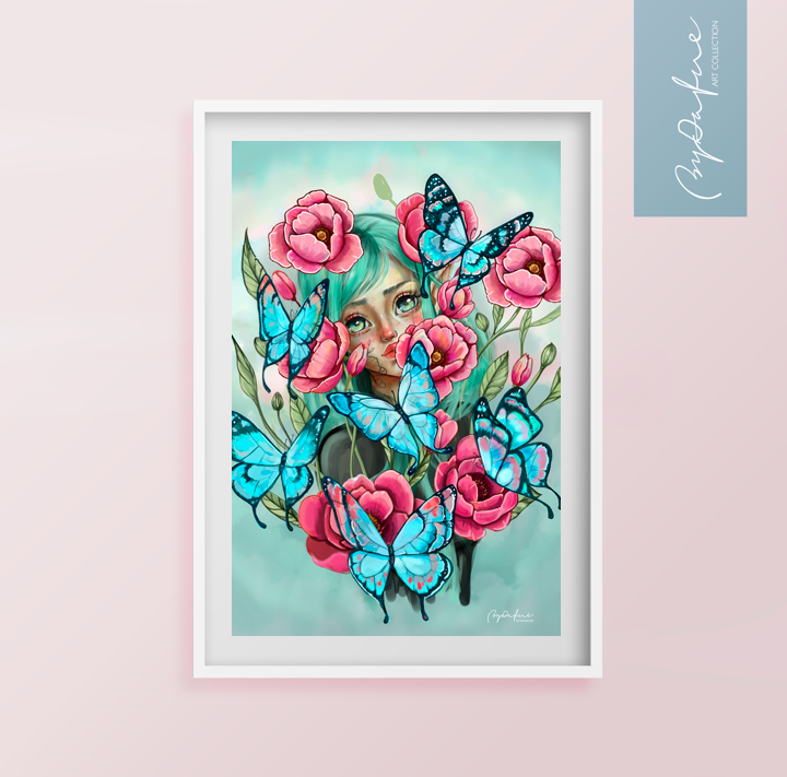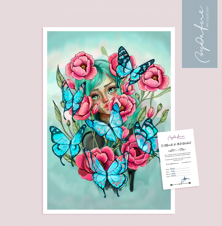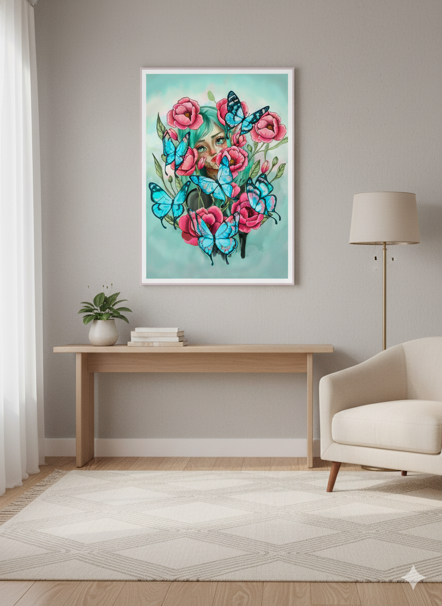 Transforma cualquier pared en un jardín mágico con nuestra vibrante lámina de Juliana. La ilustración captura una belleza etérea, enmarcada por exquisitas peonías fucsia y mariposas de un intenso azul turquesa.