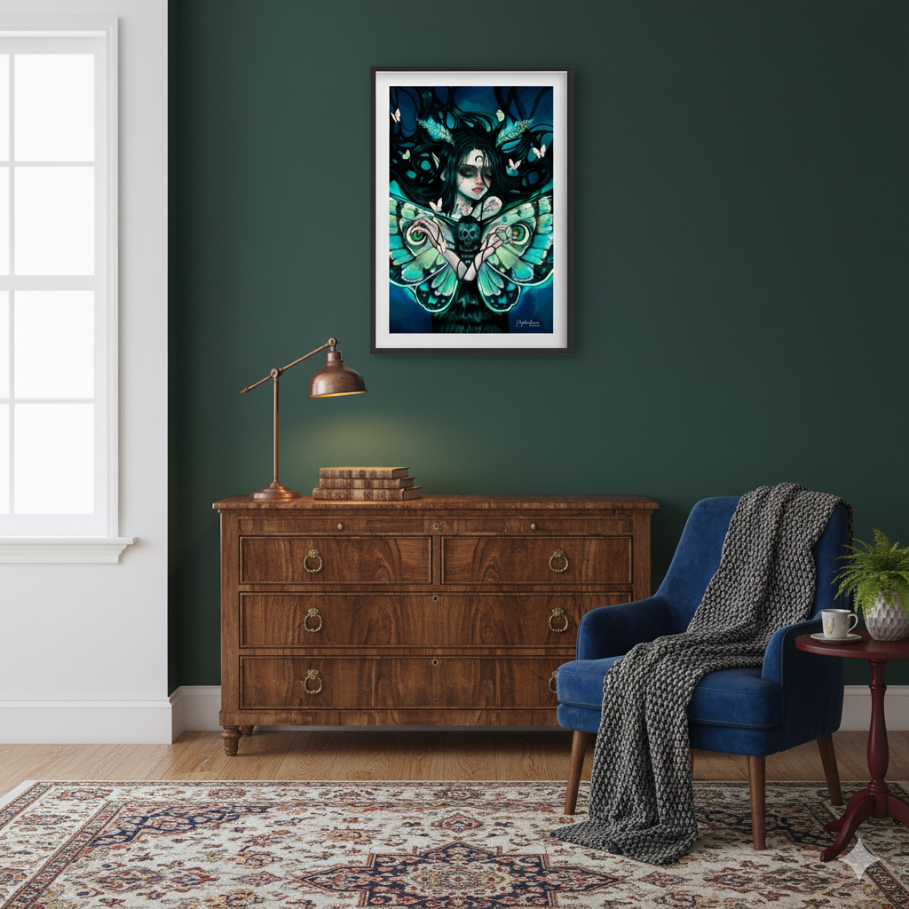 Sumérgete en la magia oscura y elegante con mi lámina 'Mariposa Nocturna'. Esta cautivadora ilustración combina la belleza etérea de una figura mística con los vibrantes tonos esmeralda y azul profundo de la noche.