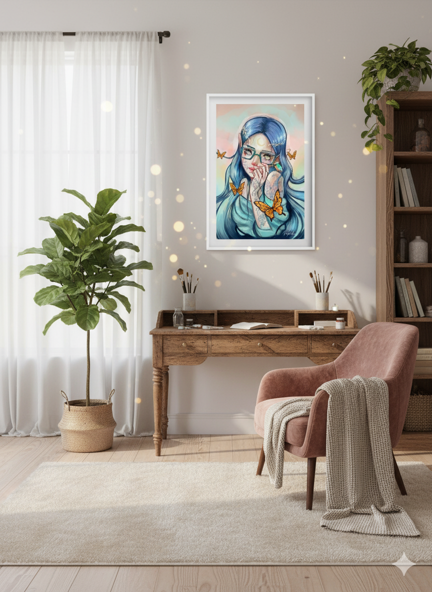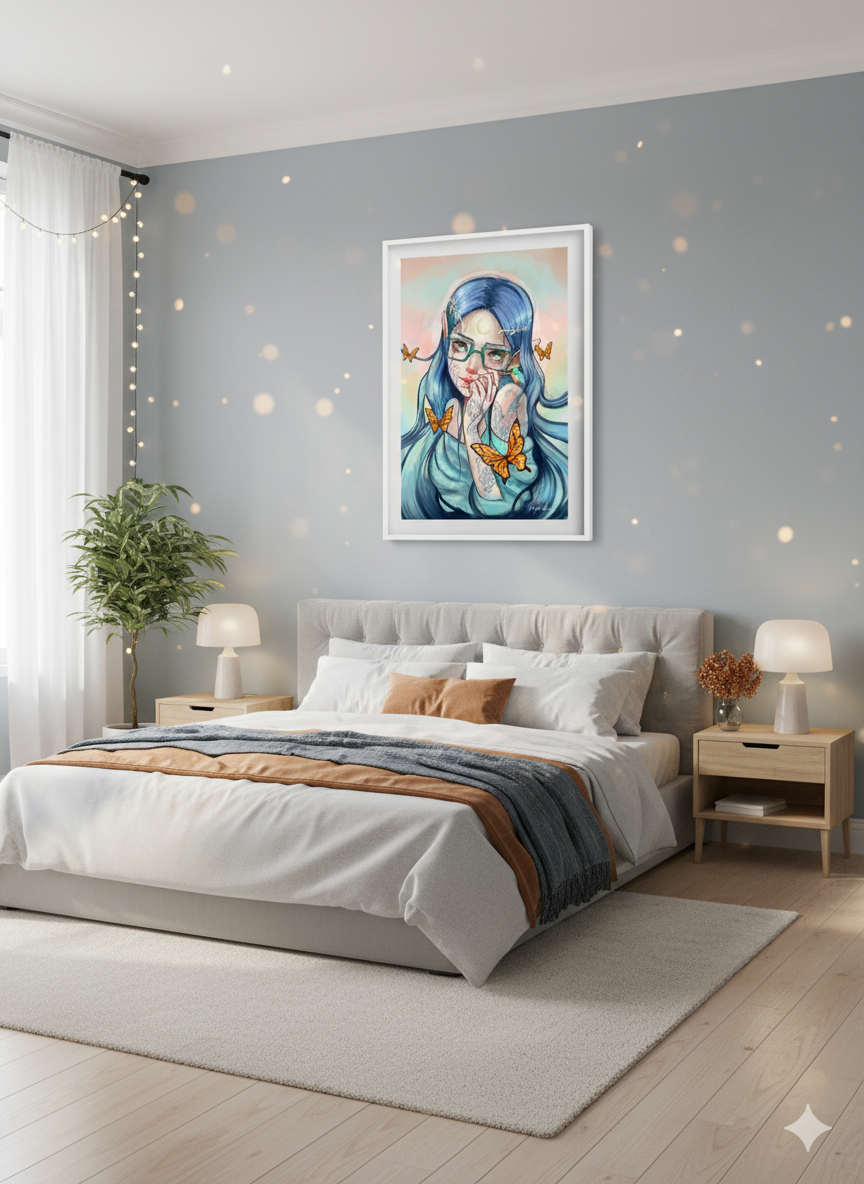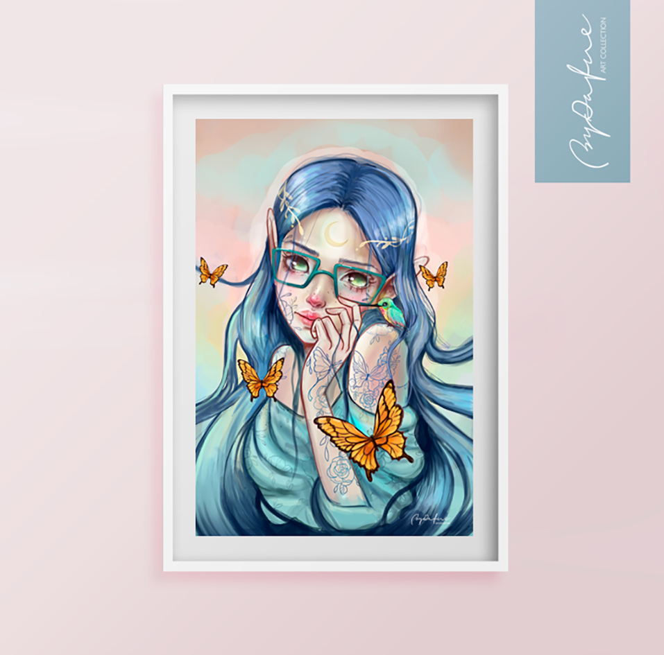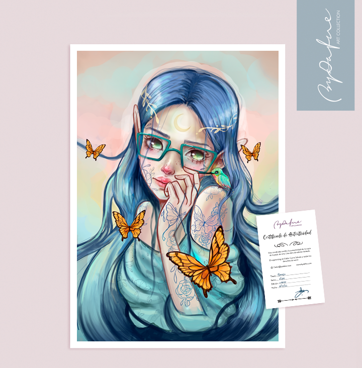 Etérea y soñadora se cuenta que Lucía es la única capaz de tejer el delicado velo entre el mundo de los sueños y la realidad. Cuando alguien pierde la capacidad de soñar ella aparece en sus noches más silenciosas trayendo consigo un resplandor suave y reparador lleno de colores como el amanecer.Su cabello azul refleja la inmensidad del cielo nocturno las mariposas que la rodean son mensajeras capaces de transportar los sueños. Su pequeño colibrí que descansa sobre su hombro y comparte sus secretos.❤️Con sus ojos llenos de estrellas puede mirar dentro del alma de cualquier ser y ver los sueños que esconden incluso los más olvidados.Recordándonos que los sueños no solo son un refugio sino también una fuerza que puede transformar la realidad.🦋💫