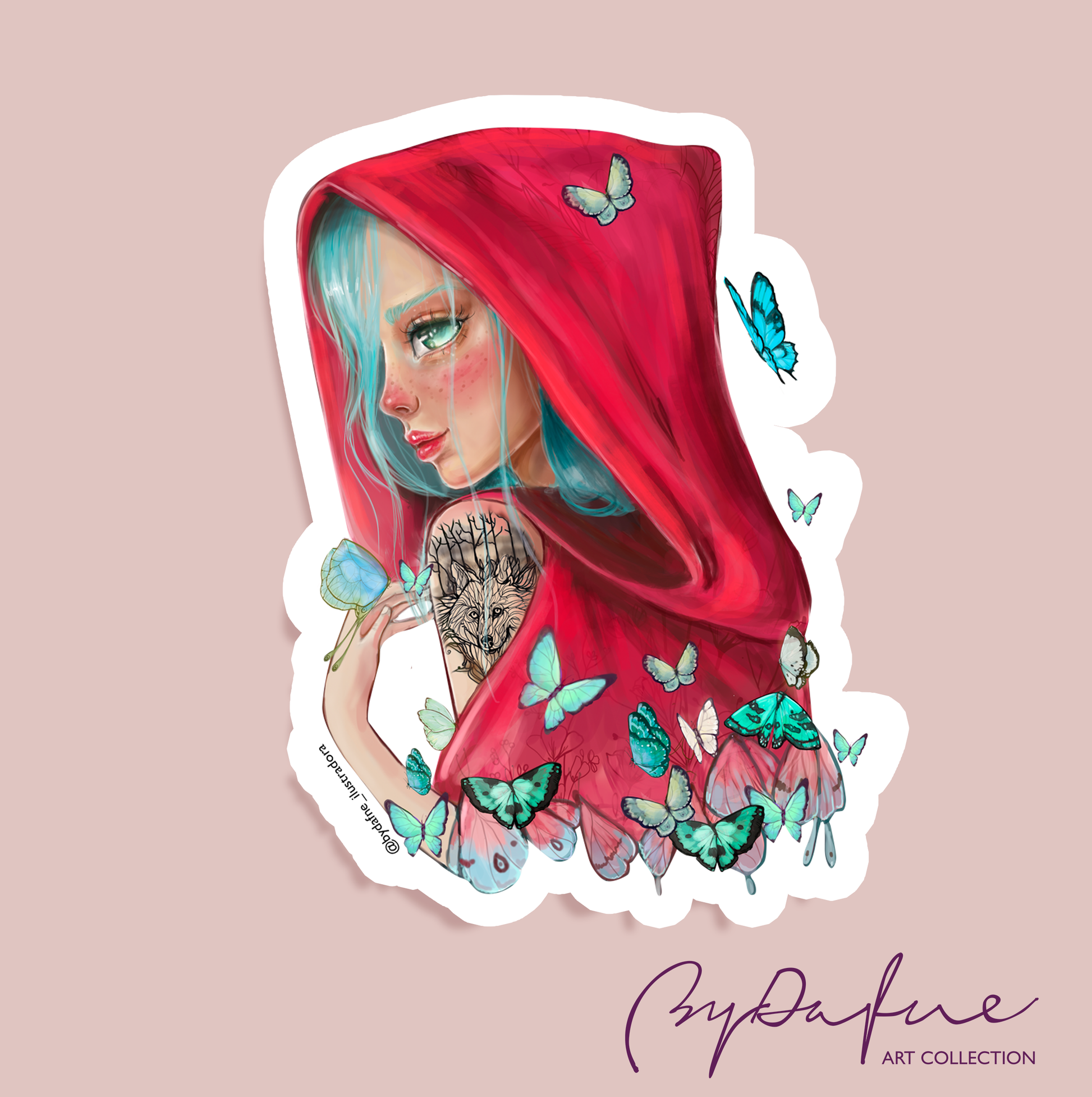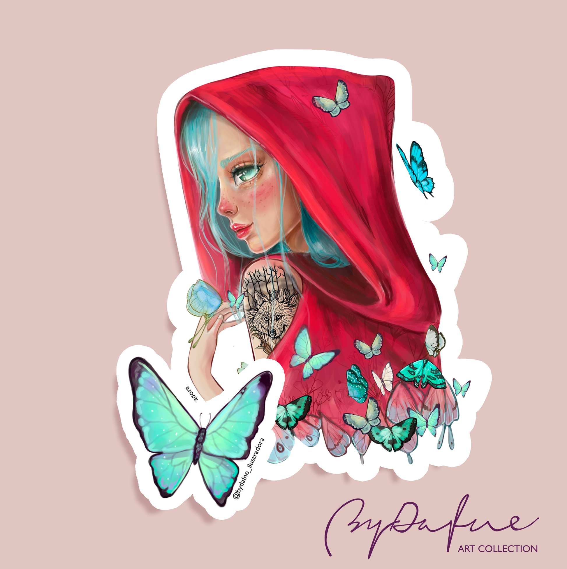 Mi pegatina de Caperucita Roja, una ilustración que reinterpreta el mito: ya no es una víctima, sino una mujer que ha abrazado su lado salvaje (el tatuaje del lobo). Está rodeada de mariposas, el símbolo universal de la transformación, el renacimiento y el cambio.